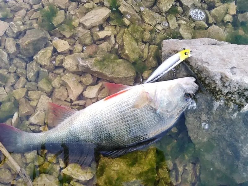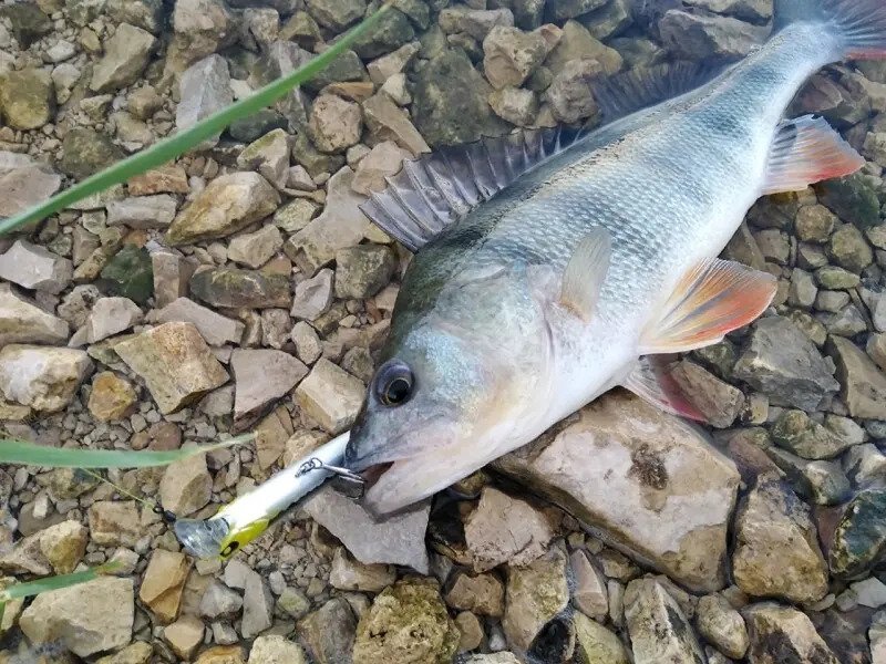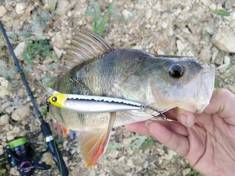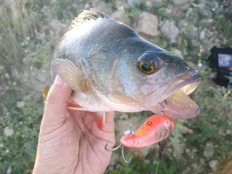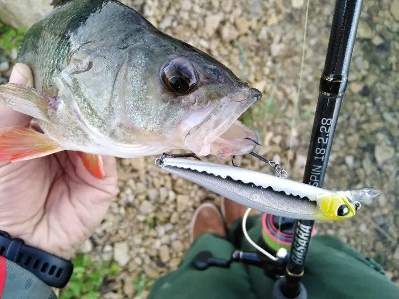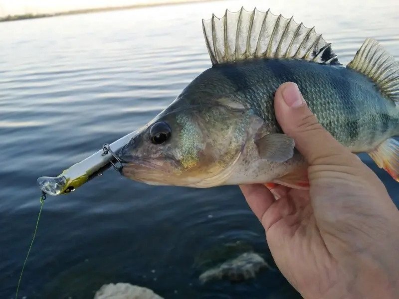 Вы, наверняка пересмотрели кучу видеороликов с красивой подписью «заброс-рыба», и именно в похожей ситуации нам и посчастливилось оказаться. И дело тут не только в количестве, но и качестве пойманных хвостов. У меня на том конце шнура 90-я Basara от LJ, у напарника небольшая личинка на джиг-риге. Не знаю случайность ли, или тут действительно живёт стайка таких мордатых окуней, но мы явно оказались в «то самое время» и «в том самом месте». Что интересно: Ловля на воблеры в первые час-полтора заметно выигрывала. Нет, у напарника тоже множество поклёвок, но соотношение пойманных рыб, примерно 3 к 1 в мою пользу. Но после примерно 6:30, ситуация в корне меняется с точностью наоборот. Окунь явно отошёл от береговой зоны, и стал придерживаться придонного слоя, вследствие чего микро-джиг стал приносить заметно больше поклёвок.