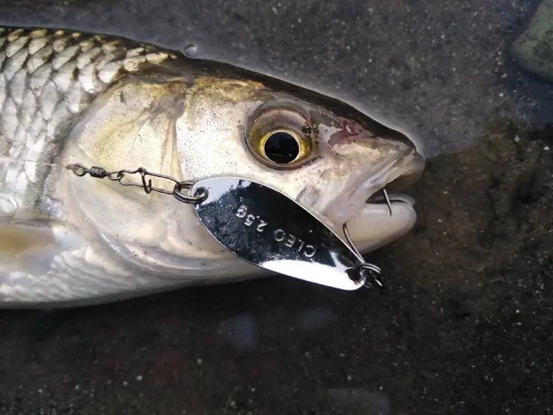 Зову напарника и понимаю, что двоим на таком небольшом участке делать будет нечего, от того ухожу на спокойное течение за перекатом. Воблерами тут, в силу мелководного участка, не особо и комфортно работать, а вот колебалка в самый раз! Классическая медленная проводка «на снос» и любимая LJ Cleo приносит и свои первые плоды. Что удивило, так это неожиданно хорошая реализация для ловли на одинарный крючок. Нет, конечно две поклёвки я всё равно проворонил, одна из которых и вовсе была «отдай спиннинг», но в общем и целом успел поймать ещё четыре рыбки, что безусловно только повышало боевой настрой. Но всё, что хорошо начинается, к сожалению, имеет и свойство заканчиваться. Солнце максимально охватившее водную гладь, поспособствовало и окончанию утреннего выхода. И мы с напарником, который так же успел отличиться, решили двигаться дальше по запланированному маршруту.