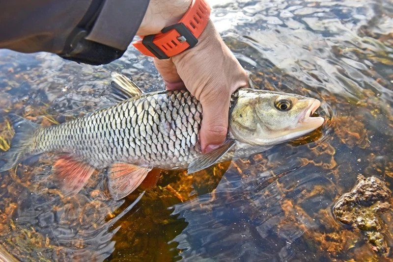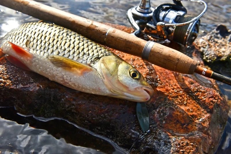 Уже на подходе к месту ловли было видно, что рыба активна, она плескалась на меляке у камней. И начал я с того самого стика... Тут стартовала необъяснимая вакханалия, голавли лупили приманку на каждом забросе, сразу же вылетали на свечку как форель и часто сходили. Но к моменту, как пришёл батя, я уже поймал пару хвостов.