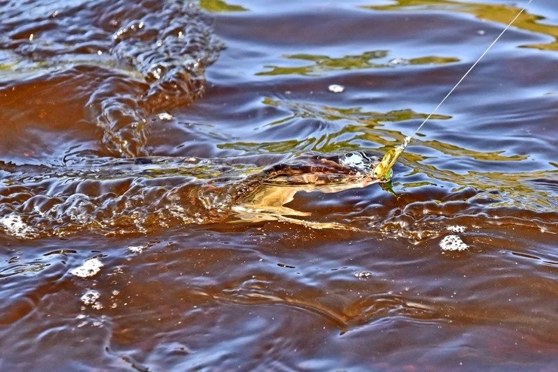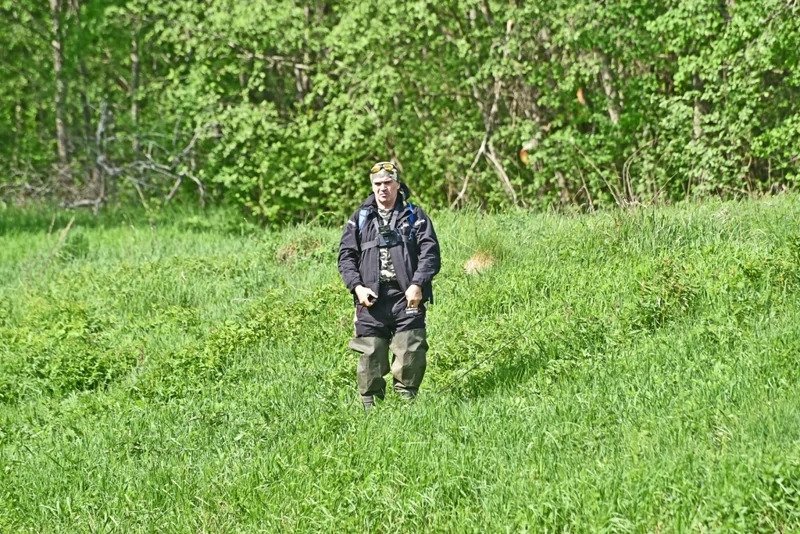 Но не успел я отдышаться, как на следующем же забросе история повторилась. Проводка с отдачей шнура завершилась мощнейшим ударом и сильным сопротивлением. На мгновение я даже подумал, что там хорошая рыба, которая ещё и завела в траву, и пришлось спускаться вниз. Но всё закончилось успешно.