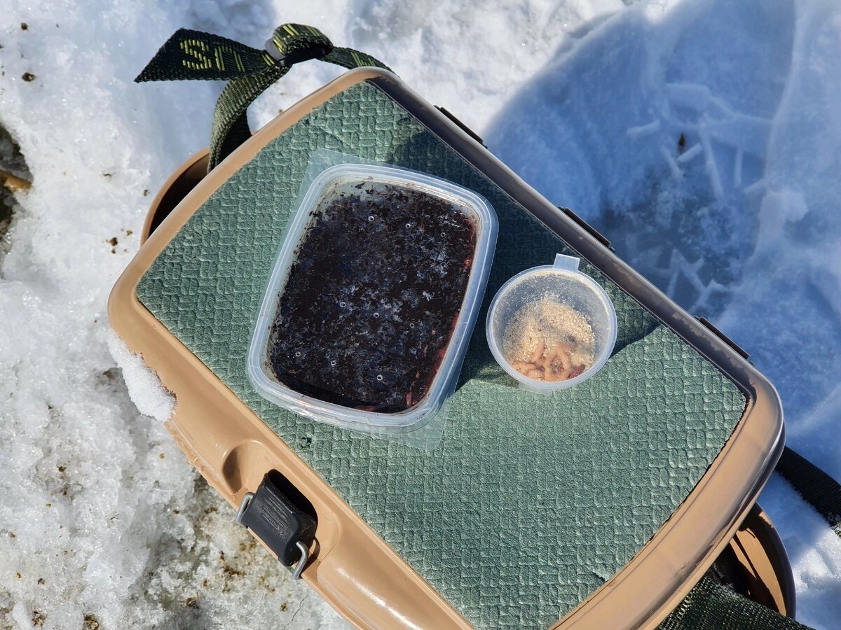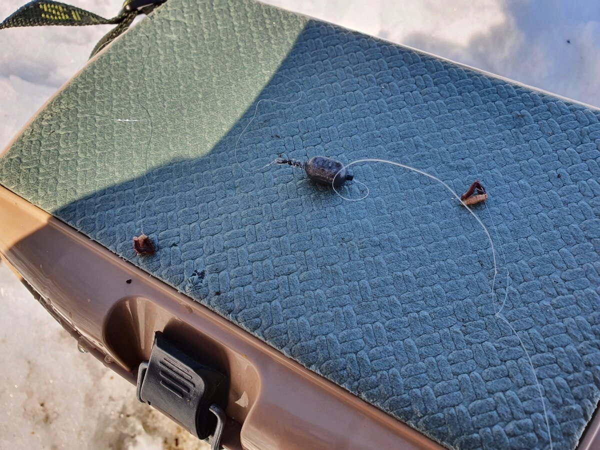 Наживка - червь+опарыш. В ящике ещё есть куриная печень. Но пока что я оставил её на потом. Этой зимой её рыба не особо жалует.