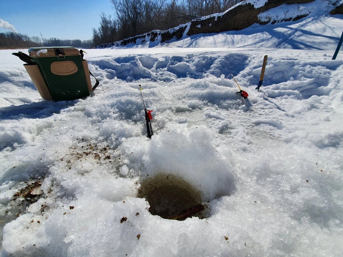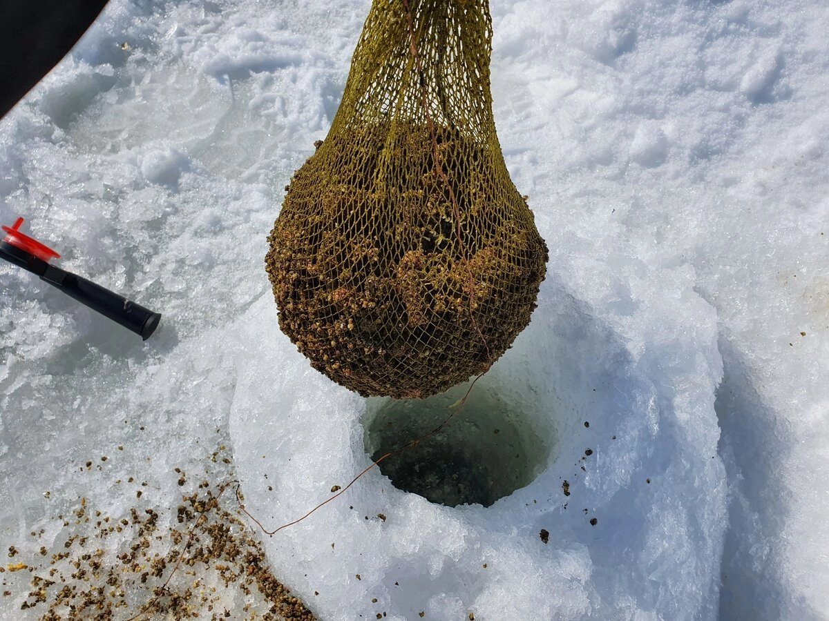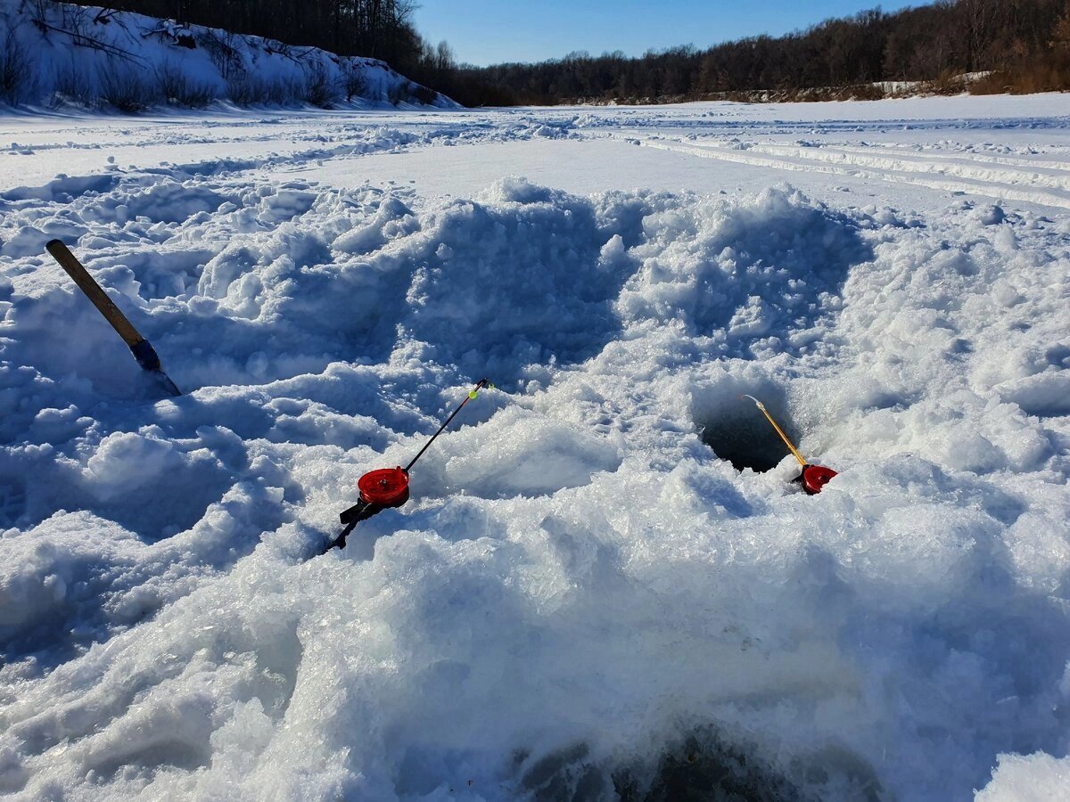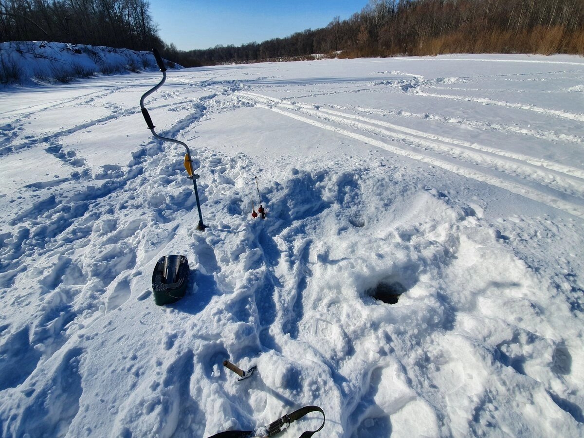 Местечко спокойное. Здесь слабое течение. Прикормки мне хватит посидеть часа на два. Ключевым оказалось слово "посидеть". Час я сидел возле лунок и смотрел на кивки. Если уж и тут не клюёт, значит точно вся рыба стоит.