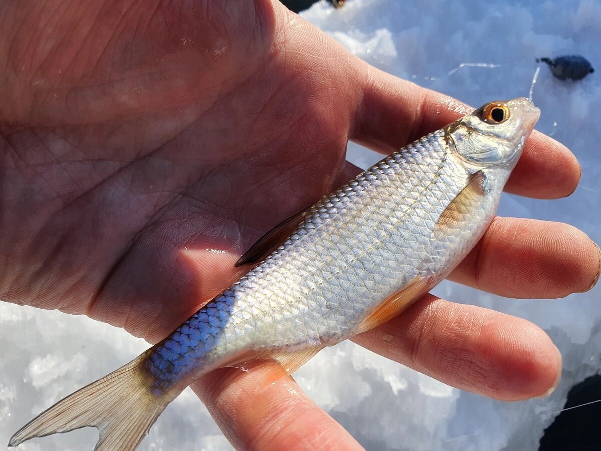 На верхний крючок клюнула плотва. За 5 часов рыбалки первая рыба. Ну сейчас наловлю!