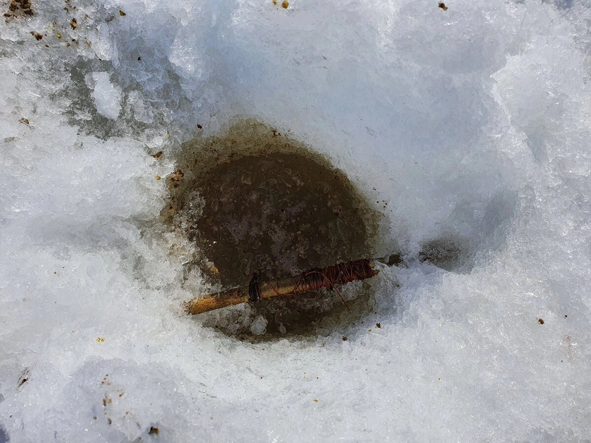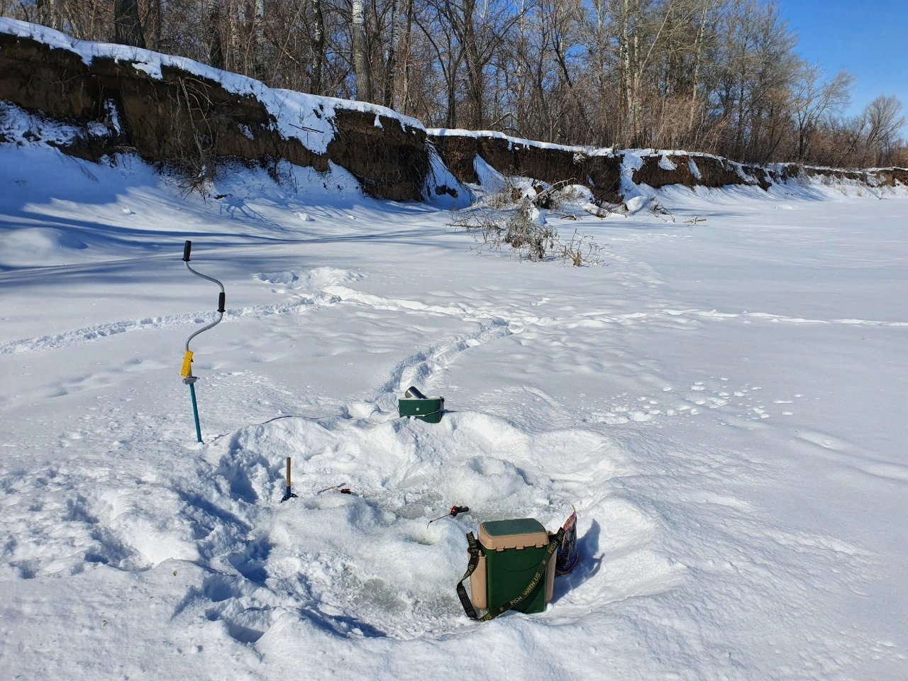 Река Сакмара. Место выбрал в коряжнике. Глубина получилась в районе 3 метров. Опустил голову в лунку - рыбы нет. Значит будем приманивать её прикормкой. Не зря же утром ходил возле неё с бубном.