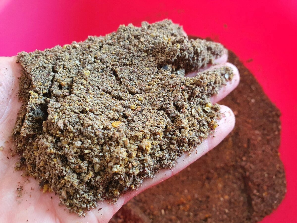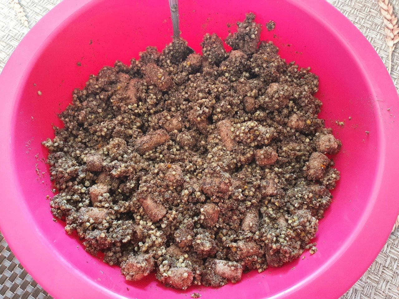 Прикормку для кошеля начал готовить в 10 утра. У меня оставалось немного базовой прикормки. Решил остатки утилизировать. Пусть пылит под водой. Основу прикормки сделал из комбикорма и варёного пшена.