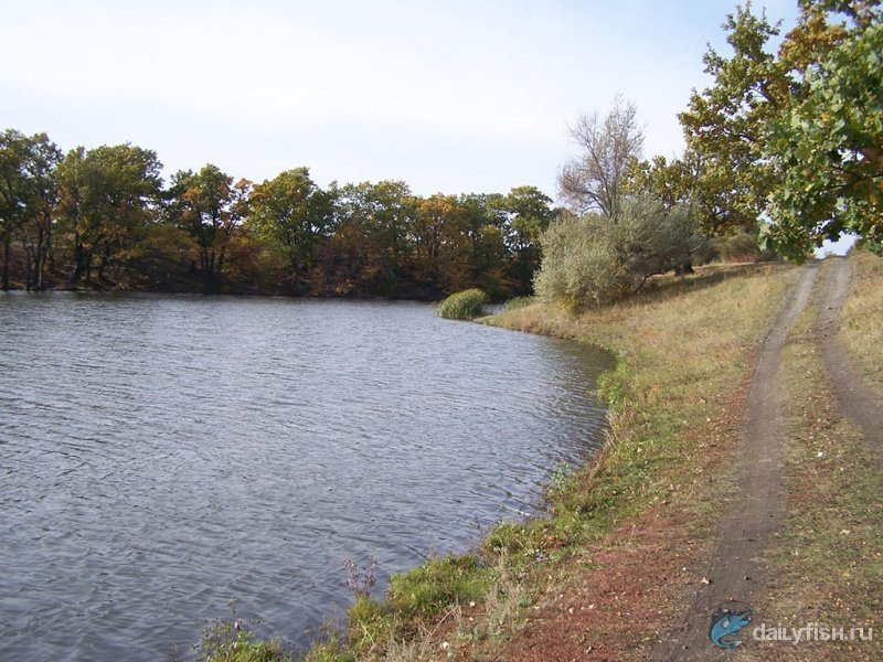 Берег ближний к горе у плотины ровный, а дольше беседки с крутым берегом, противоположенный почти ровный, с небольшим спуском в полметра. Вокруг пруда идет грунтовая дорога, асфальт подходит почти к пруду, но из-за склона берега ее не видно и почти не слышно. Одно время на дороге стоял шлагбаум, видимо кто-то пытался сделать платник, но потом дорога опять стала свободной. Ловится карась, говорят, что разводили карпа.