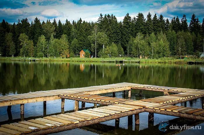 По периметру водоема с небольшими интервалами установлены просторные мостки для рыбной ловли.