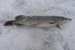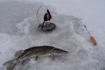 Щука на жерлицы. Так называемая русловая щука, это особая популяция представителей всем известной щуки. Живущие всё лето на просторах моря стайки (!) щук на зиму отходят зимовать на меляки в заливы и боковые речки. Крокодил! Это про зимнюю щуку на жерлицу. Выволочь на лёд «мамку» весом за 6 кг. дорогого стоит. И снасти самые-самые в щепки разлетаются, и разрубая лунку под «особый размер» напаришься!
