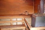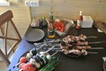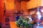 - полностью оснащенная всей необходимой бытовой техникой кухня (мебель, холодильник, микроволновая печь, электрочайник, плитка, столовая посуда), большая чугунная печка;