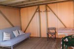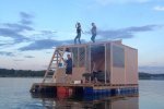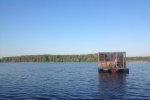 Двухэтажный плот построен на воде, позволяя насладиться прекрасным пейзажем и свежим воздухом. На первом этаже имеется стол, стулья, мангал. Для отдыха есть двуспальный диван. Также есть площадка для загара на втором этаже.