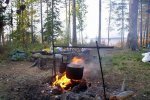 Полевой обед. Сбор оборудования и отправление к следующему месту рыбалки. Преодоление порогов «Змеиный» и «Соленый». Установка палаточного лагеря, между двумя порогами «Соленый» и «Падун». Перекус у костра.