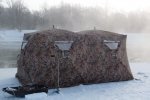 - Спустившись ниже моста по течению, я устанавливаю специальную фирменную палатку для зимней рыбалки HIGASHI CAMO DOUBLE PYRAMID (размер 4,6*2,3*2,0), в которой очень комфортно находиться и можно стоять в полный рост. Далее включаю специальный обогревающий элемент и уже через некоторое время в палатке становится настолько тепло и комфортно, что можно спокойно снять рукавицы и даже куртку. В -25° на улице в палатке температура поднимается до + 6°. В таких условиях сможет рыбачить не только профессионал, но и совершенно не подготовленный, начинающий рыбак.
