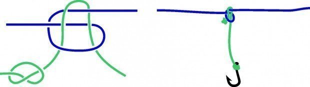 Подобный способ является самым подходящим, если осуществляется лов на живца. Но это не значит, что этот способ не годится для других условий ловли. Несмотря на то, что оба крючка вяжутся на один поводок, способ достаточно простой и легко повторяемый. Это значит, что можно очень быстро оснастить снасть вторым крючком. Второй крючок вяжется так же, как и первый: в ушко крючка продевается леска, после чего делается несколько оборотов лески вокруг цевья. После этого продевается в ушко уже противоположный конец лески. Очень легко и просто, тем более, если посмотреть видео, где доходчиво показывается и рассказывается, каким образом это сделать.