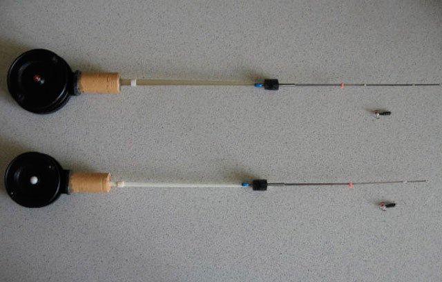 Те удочки, которые продаются в магазинах, требуют определенной доработки. Для этого нужно раскрутить винт и снять шпулю. Конструкция несколько не продумана и в месте входа лески она может перетираться о края катушки. Чтобы этого не происходило в этом месте следует установить кембрик, который также будет помогать аккуратно укладывать леску на катушку. Затем на катушку наматывается леска. Для этого на конце лески делается петля, с помощью которой леска закрепляется на шпуле. Кончик подбирается по весу мормышки. Чтобы леска не перепутывалась, параллельно хлыстику устанавливается кембрик. Затем леска пропускается через все отверстия и к ней привязывается мормышка. Привязать ее можно любым узлом, главное, чтобы это было надежно. Поскольку леска применяется очень тонкая (0,06-0,1мм), то удочка должна быть очень чувствительной, а конструкция продуманной.