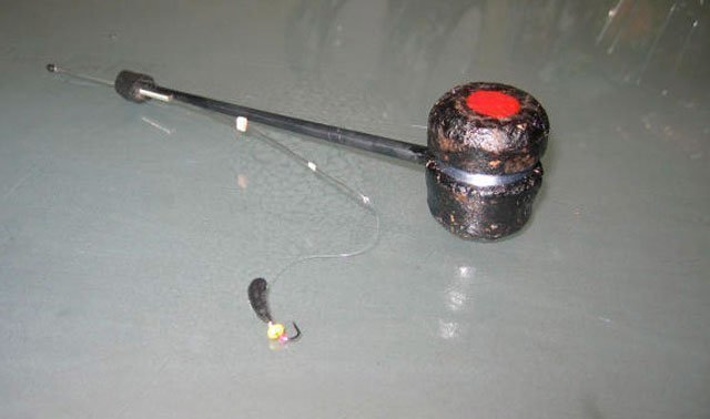 Такую удочку не сложно сделать самому. Главным элементом оснастки такой удочки является поплавок, конусообразной формы. Делается он из легкого материала (пробки или пенопласта) длиной около 3-х см, шириной – около 6-ти см и окрашивается в яркий цвет. На течении можно использовать поплавок массивнее. Для нормальной работы такой удочки необходимо грузило. Зимнюю поплавочную можно приспособить как для донной ловли, так и для ловли в отвес.