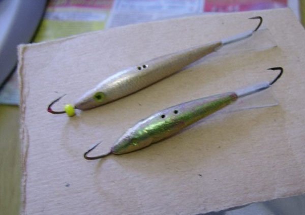 Самодельные мормышки можно изготавливать из меди или латуни, вырезая их из соответствующих листов такого металла. Медь и латунь очень легко паяются. Вырезанные заготовки залуживаются и к ним припаиваются крючки. Затем внешняя часть заготовки полируется, для придания мормышке привлекательности, и покрывается бесцветным лаком.