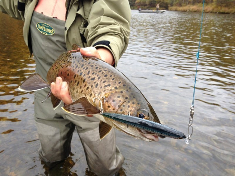 В зависимости от условий рыбалки подбирается и приманка. Когда рыбалка осуществляется в условиях, когда форель держится в верхних слоях воды, то применяются и соответствующие виды приманок, например, воблеры, которые способны погружаться на различную глубину. Не плохие результаты можно получить при применении поверхностных приманок, таких как попперы. Когда форель держится на глубине, то подойдут более тяжелые приманки.