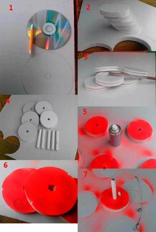 Для диска можно взять плотный пенопласт, толщиной 15-20мм.- На листе пенопласта, с помощью циркуля или какого-либо круглого предмета, делается соответствующая разметка, после чего, заготовки вырезаются острым предметом (скальпелем, лобзиком, столярным ножом и т.д.).