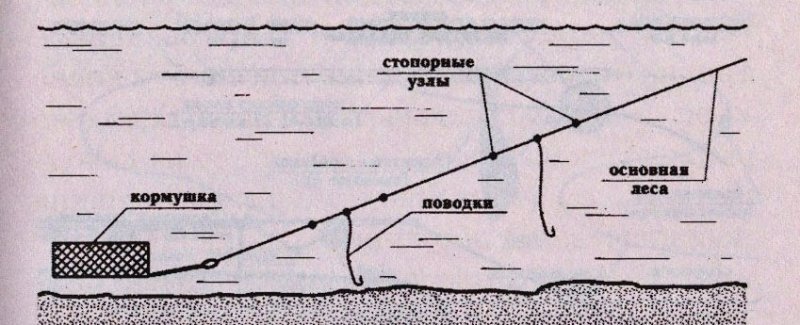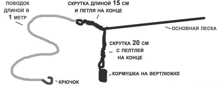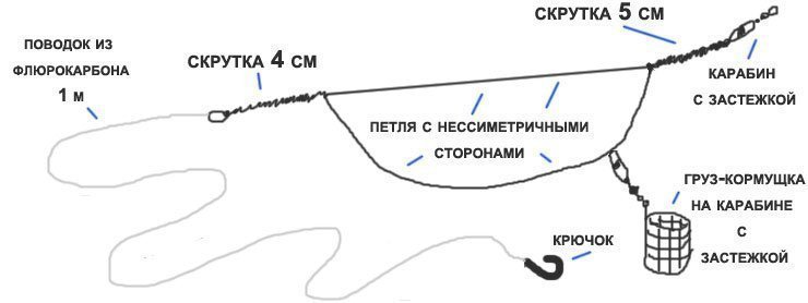 Получила широкое распространение, благодаря своей чувствительности. Связать ее немного тяжелее патерностера, но так же просто. Для этого нужно взять и отмерить 2 метра основной лески, после чего сложить ее вдвое. На конце лески связать петельку для крепления поводка. Свободный конец лески сдвинуть так, чтобы после формирования петли из него получилось плечо, несколько длиннее другого плеча. После этого вяжется двойной узел. Перед завязыванием петли, на длинное плечо следует установить вертлюжок с застежкой, что позволит затем крепить кормушку. При этом кормушка будет свободно перемещаться по этому отрезку лески. Во время забросов практически не происходит перехлестывания оснастки. Это еще одно достоинство ассиметричной петли.