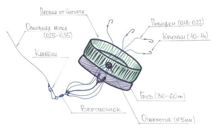 Основой лески является обычная крышка от пластиковой бутылки или другой бутылки, но имеющей пластиковую крышку. Желательно, чтобы диаметр крышки находился в пределах 40 мм, но не больше. К основанию крышки крепится груз, весом 30-50 г любым способом. В бортах крышки проделываются отверстия, к которым крепятся поводки, длиной от 5-ти до 7-ми см. В данном случае, можно использовать голые крючки, замурованные в прикормочную смесь. Хороший эффект дают пенопластовые шарики, насаженные на крючки.