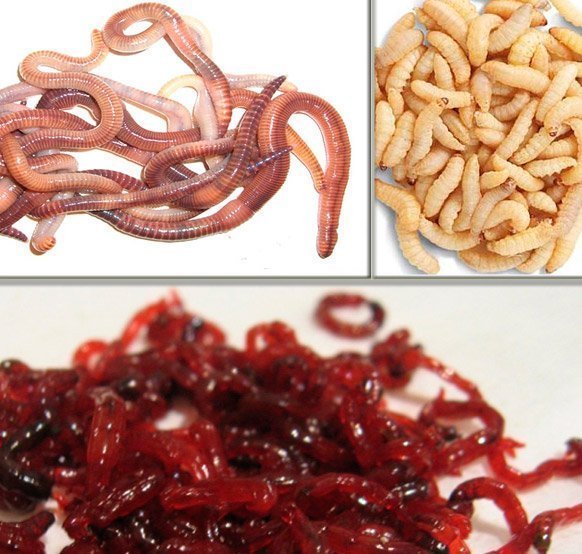 Навозного и дождевого червя.- Кормового или мелкого мотыля.