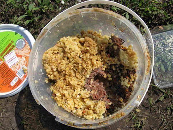 Для результативной ловли, желательно, чтобы прикормка содержала как крупные, так и мелкие фракции. В качестве крупных фракций часто используют кукурузу, горох, перловку, пшеничную крупу. В качестве мелких – пшенку, панировочные сухари или, те же горох или кукурузу, но перекрученные через мясорубку. Они необходимы для создания пищевого пятна, которое очень активно привлекает рыбу, и в частности, карася. Рыба отдает предпочтение смешанным прикормкам двух и более цветов.