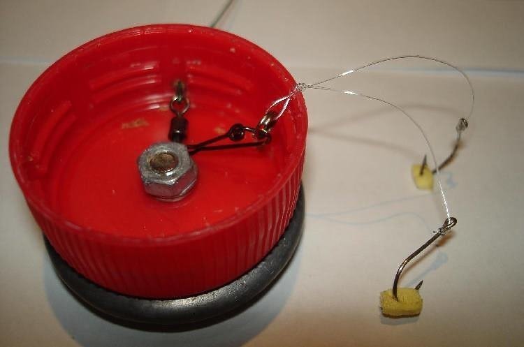 Простота заключается в том, что ее можно просто смонтировать из подсобных материалов. Основой ее конструкции является пластмассовая крышка из пластиковой бутылки, небольшой кусок проволоки, диаметром 0,6мм и поводок с крючком длиной 5-7см. Компактность заложена в самой конструкции: грузок круглой формы прикручивается непосредственно к крышке снизу. При забросе никогда не перехлестываются поводки, так как они прячутся в прикормку, и только после попадания снасти в воду, когда начинает постепенно вымываться прикормка, освобождаются крючки с наживкой.