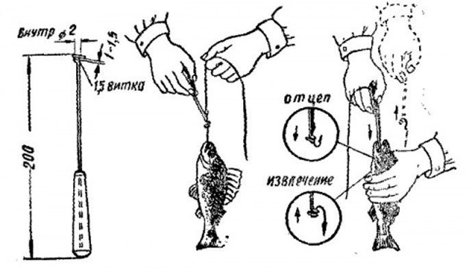 Экстрактор для рыбалки предназначен для того, чтобы быстро извлечь крючок из пасти рыбы. Существует два вида экстракторов: один вид выполнен в виде иглы, на конце которой имеется специальный разрез, с помощью которого и осуществляется процесс извлечения, а второй вид изготовлен в виде щипчиков, с помощью которых захватывается крючок и вытаскивается. Чтобы захват был надежным, на кончиках щипчиков сделаны засечки, которые позволяют надежно захватить крючок.