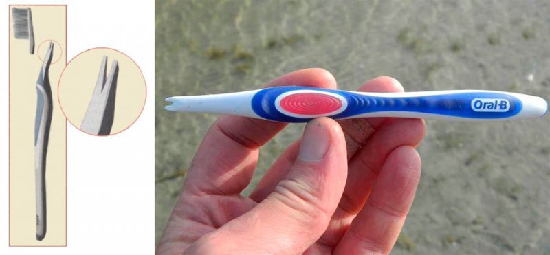 От старой зубной щетки следует отпилить щетину вместе с головкой. Если зубной щеткой никто не пользуется, то можно купить, причем, самую дешевую. В результате подобных действий, останется от щетки ножка. Причем, чем она длиннее, тем лучше, так как удобнее будет работать. Чтобы инструмент стал работоспособным, следует в ножке сделать не большой пропил, который и будет помогать извлекать крючки разных размеров.