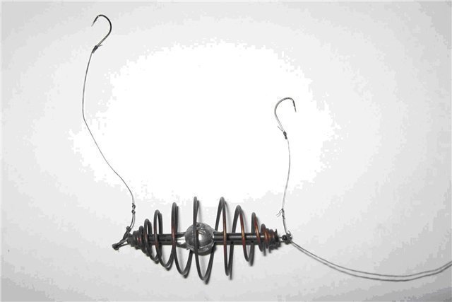 При втором варианте оснастки на пружину устанавливают короткие поводки, которые утапливаются в приманке, располагающейся в пружине. Фактически в данном случае приманка используется в качестве подкормки и наживки. Второй вариант отлично подойдёт для ловли леща и карпа. В этом варианте оснастки рыба засекает себя самостоятельно, а рыболову необходимо лишь вытянуть её из воды. Можем порекомендовать вам использовать для поводков леску плетёнку с толщиной 0,1 — 0,15 миллиметра.