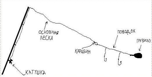 Конструкция донной снасти чрезвычайно проста. Леска наматывается на шпулю или мотовило, имеет большое по размеру грузило, выше которого находится несколько поводков с наживкой.