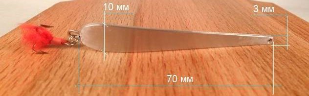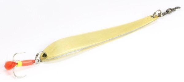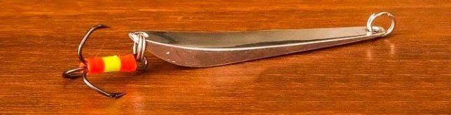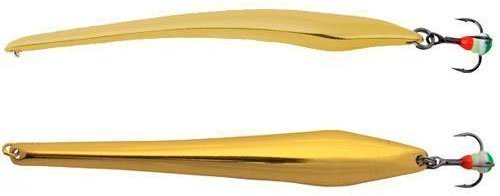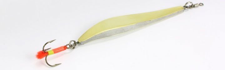 Это тяжелая блесна с конкретным назначением ловить хищника на сильном течении и на больших глубинах. Судак никогда не остается равнодушным к игре подобной приманки. Тело этой блесны делается из двух пластин различного металла: золото-серебро. Плюс ко всему на тройнике крепится красное оперение или красный кембрик, что безотказно действует на хищника, такого как судак.