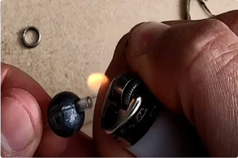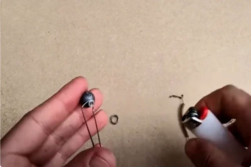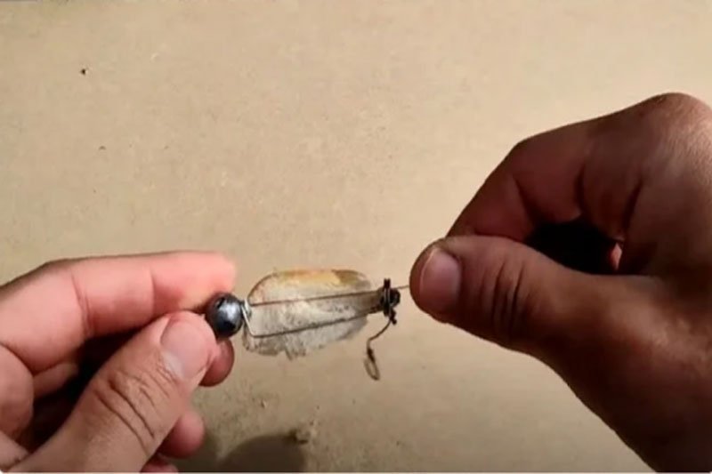 Сначала необходимо через всё грузило по центру просверлить и расширить отверстие диаметром, чуть больше диаметра пасты от ручки.