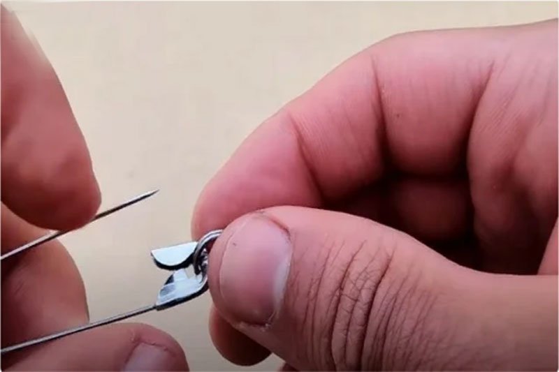Затем нам необходимо через головку булавки продеть заводное кольцо. После, через это самое колечко и через саму трубочку провести основную леску.