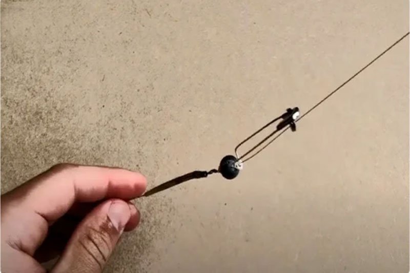 К свободному концу лески привязываем вертлюжок. А перед этим на лесу нанизываем маленькую бусинку - она нужна, чтобы не сбить узел.