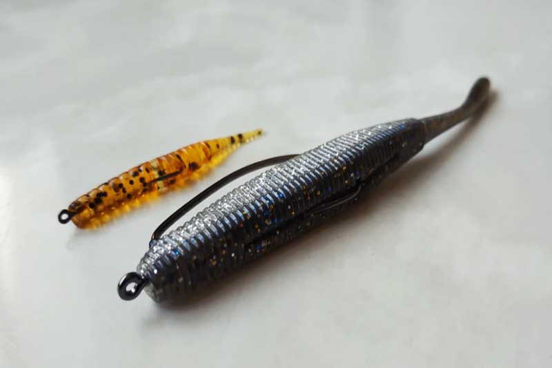 Если ловля ведется в водорослях, отличным вариантом будет использование неогруженной резины на офсетном крючке и для основной, и для дополнительной приманок.