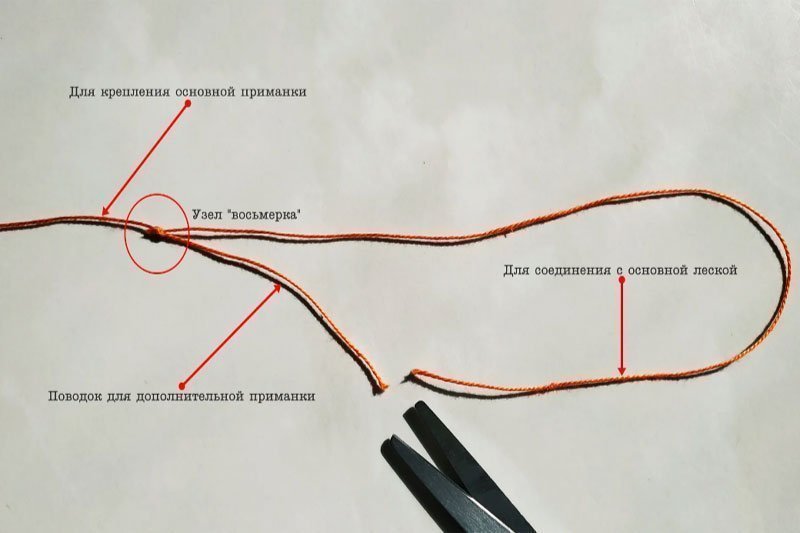 Возьмем отрезок обычной или флюорокарбоновой лески и с помощью узла "восьмерка", сделаем на нем петлю длиной 20-30 см, а затем, надрежем ее так, чтобы один из концов был длиной 5-10 см.