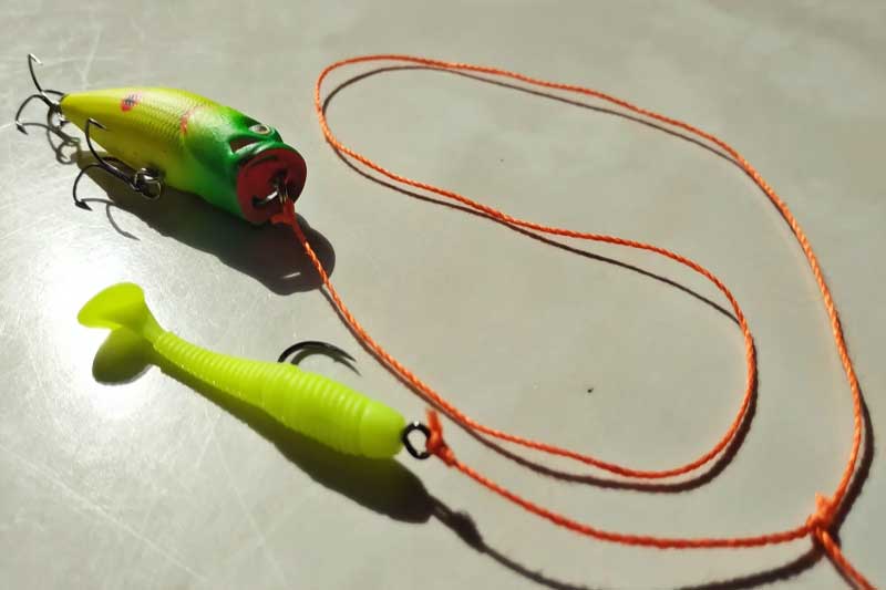 В этом тандеме, поппер будет выполнять роль мелкого хищника гонящегося за мальком, которого имитирует мягкая приманка. Такая комбинация провоцирует на хватку даже капризного хищника.