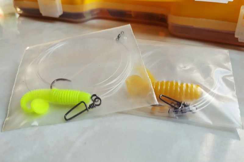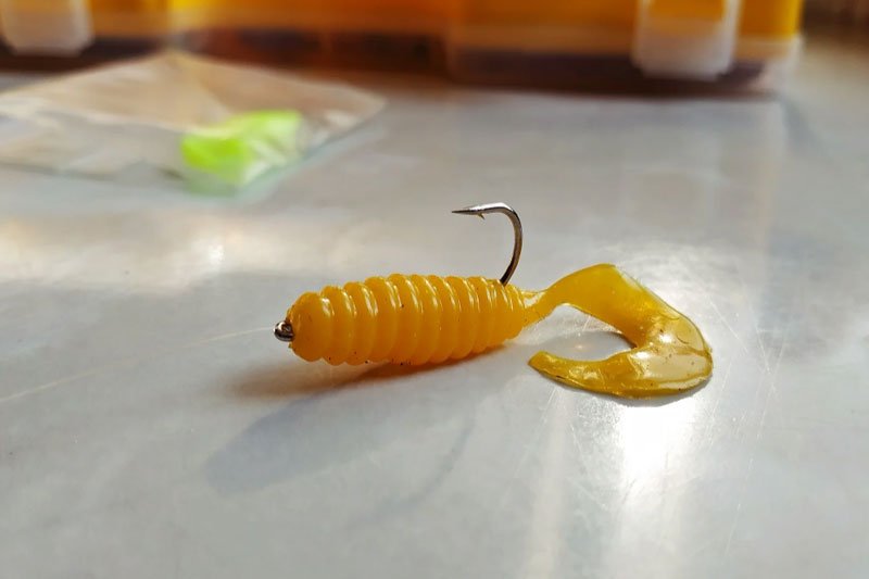 Приманка крепится на офсетном, либо на обычном крючке с удлиненным цевьем.