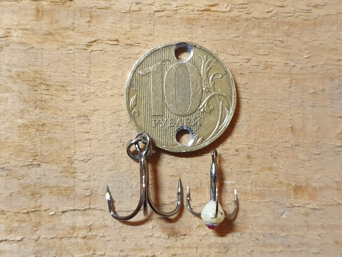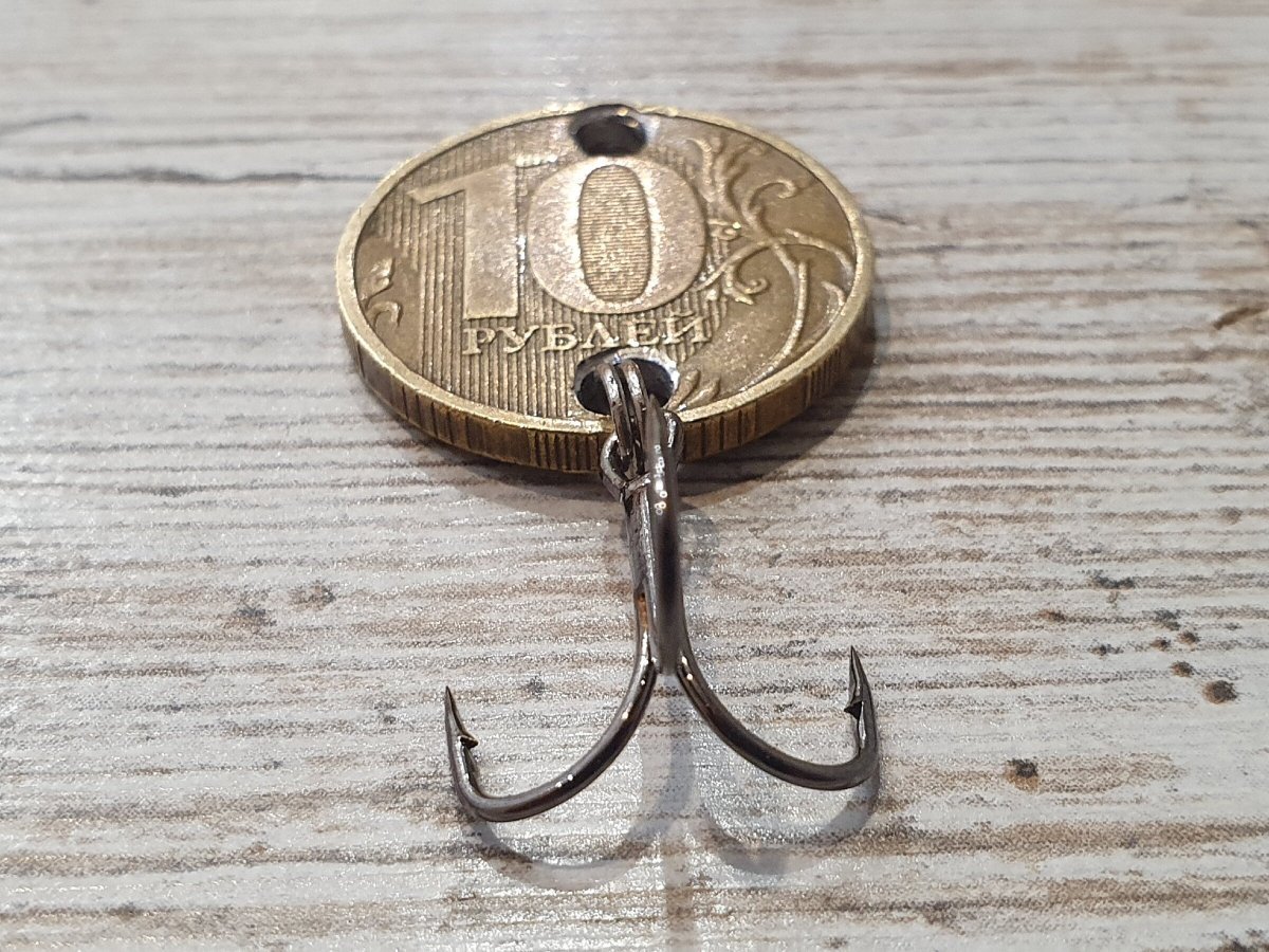 Сегодня я случайно в кармане нашёл 10 рублей, и в голове тут же всплыла картинка блесны. Буквально за 5 минут сделал её. Просверлил два отверстия сверлом 3мм. Монета сверлится замечательно.