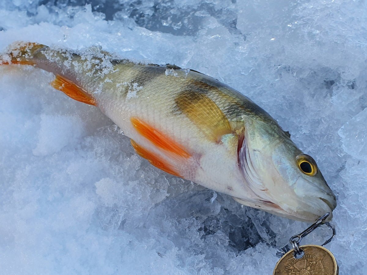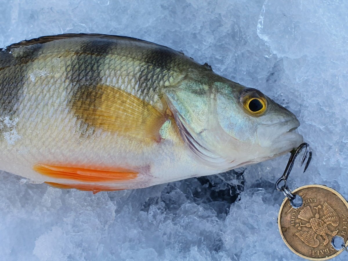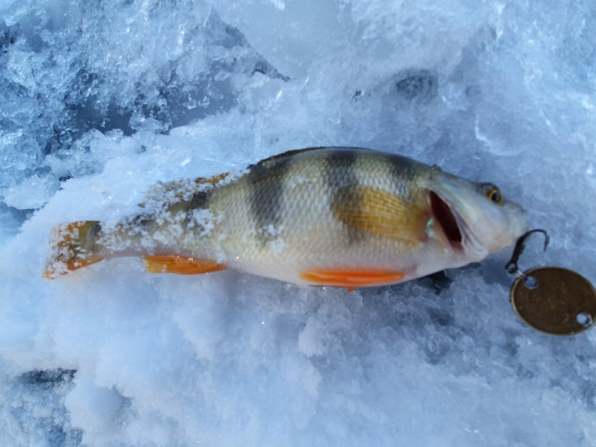 Через некоторое время опустил блесну в соседнюю лунку и снова кого-то подсёк. Думал щурёнок небольшой, но оказался крупный окунь.
