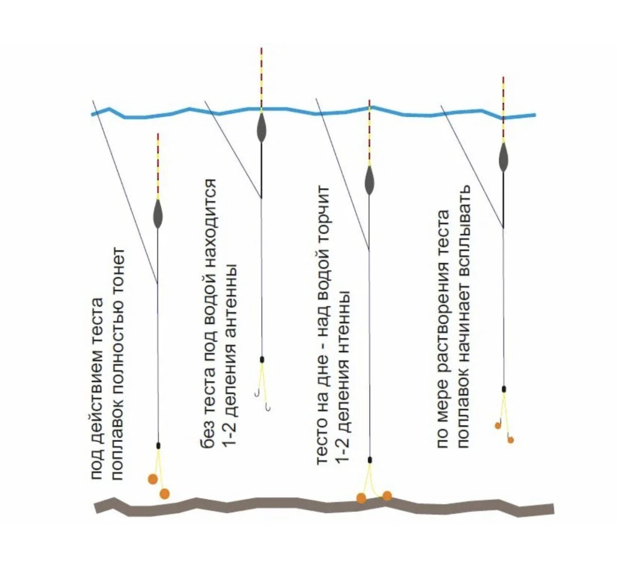 Когда тесто размывается, оно создаёт вокруг крючков облако прикормки — рыба тянется на аромат, а сам поплавок начинает медленно подниматься. Как только антенна полностью всплыла — значит, насадки больше нет, пора перезабрасывать.