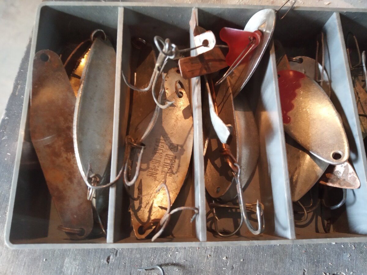 Недавно пошёл в гараж за инструментом и обнаружил там старый набор блесен, советских времён. Коробка оказалась набита различными колебалками и даже самоделом.