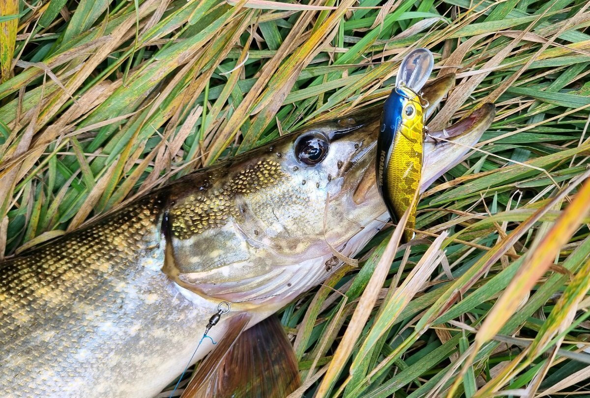 Несмотря на положительную плавучесть, с поводком струной он очень медленно всплывает, поэтому я решил воспользоваться этим свойством для применения техники равномерной проводки с паузами (stop&go), результат не заставил себя долго ждать. Проводя воблер в паре метров от границы водной растительности, получил первую атаку щуки на паузе и успешно ее реализовал, причем с первого заброса.