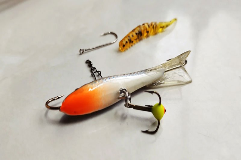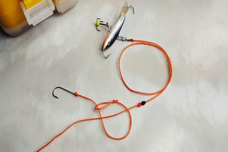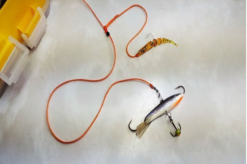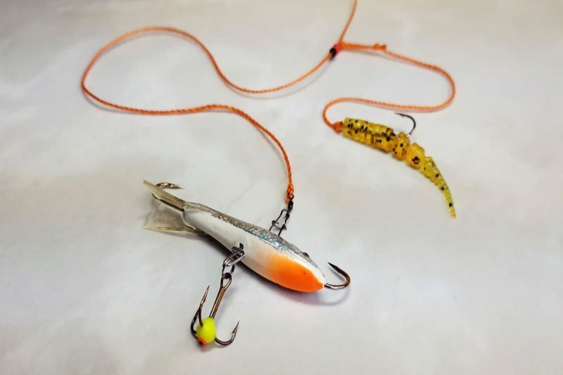Данная оснастка состоит из основной приманки, роль которой может выполнять достаточно крупная судаковая мормышка или балансир, а также дополнительной: крючка с подсадкой малька или небольшой силиконовой приманки.