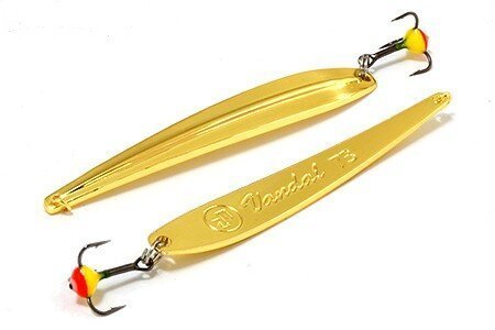 Также зимняя вертикальная блесна для спиннинговой ловли. Оснащена впаянным крючком с тройником (есть модели и с одинарным крючком, но они менее надежны), каплей и цепочной оснасткой. Произведена из латуни, что позволяет выбрать размер поменьше для большой глубины, благодаря большей плотности. Анимируется достаточно плавно, покачивается с небольшими амплитудами - хищники видят в ней малька. Отличительной особенностью является ручная полировка с гальваническим покрытием: золотом, серебром и медью. Если вы планируете идти с ней на окуня, следует обратить внимание на модель с тройником весом 6,7 г и длиной 3,5 см. Все это обойдется в вполне приемлемую цену.