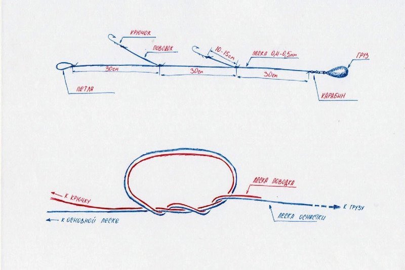 Схема оснастки для ловли окуня (сверху). Схема узла (снизу).