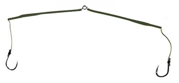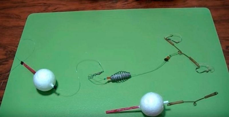На изображении видно, что основная леска проходит сквозь поплавок. Если поплавок закрепить с помощью застежки, то получится более универсальная снасть. В случае использования только одного крючка, без коромысла, то можно получить более чувствительную оснастку.