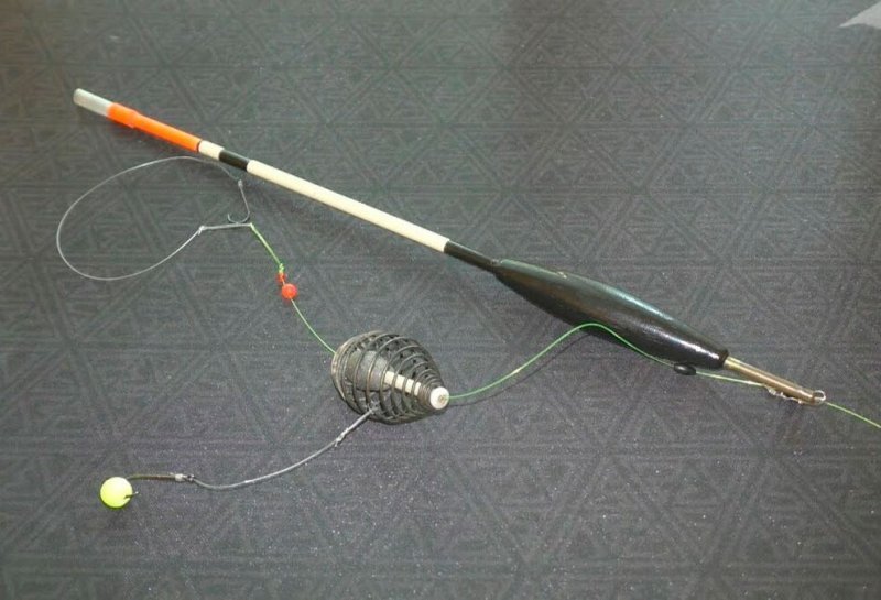 После того, как на удочке смонтированы все основные элементы, на конце формируется петля для крепления коромысла с крючками или поводок с одним крючком. На изображении ниже можно увидеть, как выглядит собранная удочка с кормушкой.