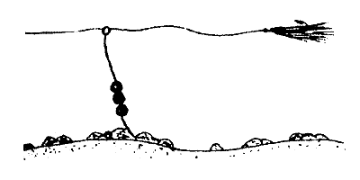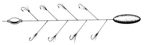 Подобная оснастка состоит из груза, закрепленного на конце основной лески. На расстоянии 20-30 см от него располагается несколько поводков с крючками, на которых размещаются приманки. С помощью подобной оснастки ловят рыбу в отвес. Как правило, ее применяют для рыбалки на море, где имеется существенная глубина.